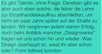Ich finde den Artikel nicht gut, finde es traurig, dass man lieber eine Satire über Lebensvorstellungen schreibt, als wirklich erfolgreiche Menschen der Blogszene vorstellt. In meinen Augen haben sich die Autoren ein bisschen zu weit aus dem Fenster gelehnt, sie sollten vielleicht einmal über ihr Leben schreiben, ob sie auch wirklich immer die richtigen Entscheidungen gemacht haben, und ihren Träumen und Wünschen nach gegangen sind.